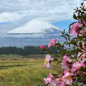 今朝の富士山と、山茶花の花二色 (2022.11.27 7:30 御殿場市より)