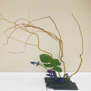 今日の華道部お稽古、立派な雲竜柳が届きましたー!😁よく曲がる花材でたのしかったです。先生から、細部にも意識を向けて手入れをするようにとのご指導が。。 まだまだ余裕がないです💦 11/15 花材: 雲竜柳、モンステラ、スターチス