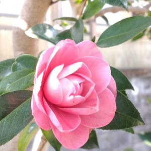 庭の椿たち 5枚目は1枚目と同じ木なのだけど 夕陽を浴びて赤く見えてます 4枚目の金魚葉椿 今年は沢山咲きました 小さな木なのに50個は咲いてたなぁ 年によって色々 p