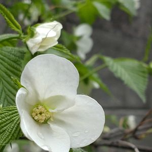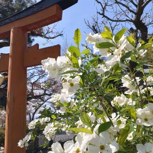 今日のお花 リキュウバイ(利休梅) 茶花として愛されて来た為 茶人 千利休にちなんだ名が つけられたものらしい とか… 母は茶室に飾る花をなるべく自前でと 庭に色々植えていた様だったけれど 子供の頃から 利休梅は見た覚えがないなぁ なんて思いながら これが利休梅なんだぁ と先日 お出かけ先で名札を確認して ぼーっと眺めて来たのを思い出して 今日のお花に投稿♡ 2枚目はお花ピンボケ でも左に飛んでる虫をこれまた偶然 捉えていたよ🐝😆😅 2025年4月9日 宇治 恵心院にて p