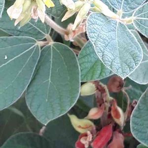なんでしょう? クリーム色の花に枝豆をちーさくしたような実 実の色がラズベリーっぽい赤でかわいい( *´艸)