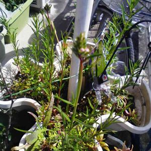 日当たり最高場所 苺などに向く回転できる鉢にニゲラ蕾が確認。 茎の先端に薄いピンク色が 見辛い写真ですが皆さんのスマホからは拡大出来て見えますでしょうか? ニゲラ株は細長い茎と葉 プランターを支える支柱をよく見てね~
