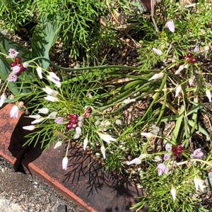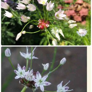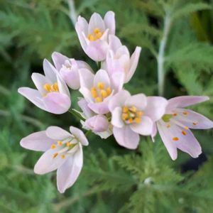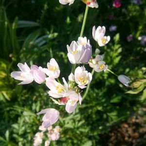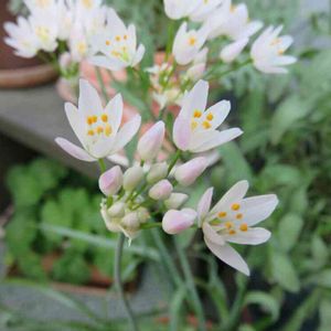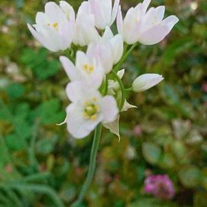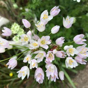 アリウム・ロゼウム ネギ(ユリ)科アリウム属 ネギやタマネギ 🌱ラッキョウ やニラなどと同じ仲間🌿 6弁花を十数輪ほど放射状に花柄をつけ💕薄い皮膜を破って現れる💕 桜貝の様な小さなお花🤗 つぼみは淡いピンク🌸ですが 開花すると白色になります⚪️ 中央に筋のある6枚の花弁💕 中心は1本の雌しべと6本の雄しべが直立しています😊 風に優しく揺れながら やっと咲きはじめました⤴️