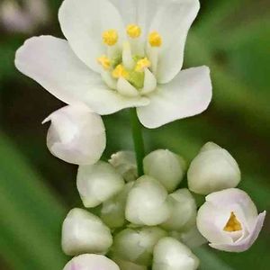 30センチくらいに伸びた細い茎に白い小花が咲きます。日が経つとピンク色になってきます。 花が終わると赤いプチッとしたのができて、中に種が入ってます。