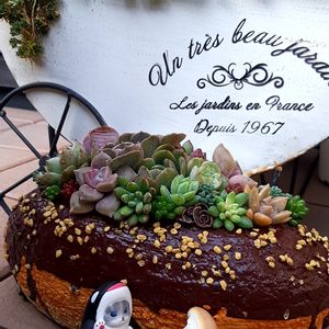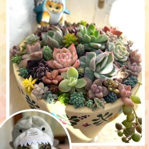 家は猫買ってないので お気に入りの サメにゃんフィギアで にゃんにゃん祭り参加します🐈 美味しそうな鉢に 寄せ植えし直して 一緒にパチリ📸