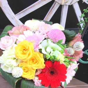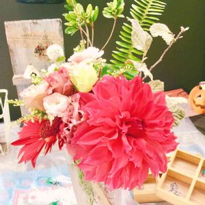 おはようございます😃 台風の影響はありませんでしたか?風が強く吹いています💨 まだまだ気を付けないと🌀 2日続いてのレッスンでした💐 楽しい時間でした💕 先生が御結婚されてました💕💕 2ヶ月お休みしてたので失礼しました💦 お話を聞いたら、お友達の娘さんとだと知り😳2重のビックリ‼️ 世間の狭さを実感しました😆 レッスンのアレンジとは違いますが、お祝い用にまとめて見ました✨ お幸せに✨✨💕