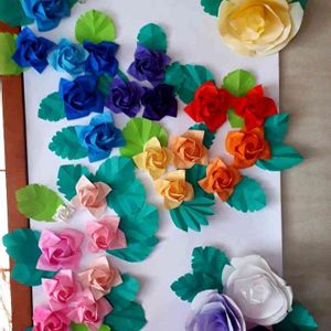 今朝は早く目が覚めてしまったので、長女が折りためた折り紙ローズ🌹に、葉っぱをせっせと作って飾り付けてみました☺
