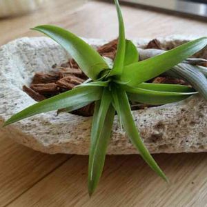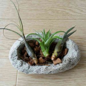 緑葉種3人組はお花屋さんの2階で見つけた軽石の鉢に置かれることになりました。わが家でタワシに乗っていないのはこの人たちだけです。