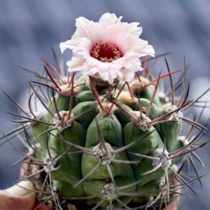 Gymnocalycium pflanzii 天賜玉(てんしぎょく)💥 深緑色のマットな肌に白いトゲの渋い子ですが・・・水やりでトゲが濡れると赤刺のかわいいサボテンになっちゃいます🤭