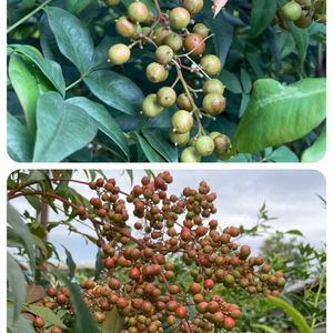 ☆庭のお花達☆ ナンテンの実が 少し色付き始めてきました〜 実もたくさんで、重そうです! いつの間にか、鳥さんにやられ 例年お正月頃には、かなり 少なくなっています😵😆 上の実に、カマキリの巣を👀😅