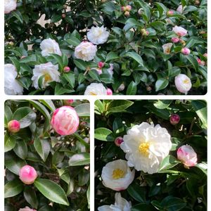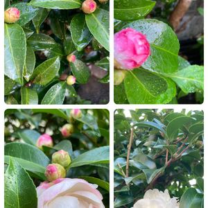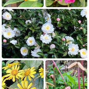 ☆庭のお花達☆ ↑バイカウツギ この時期、又枝先に一輪🤔 普通6月から7月頃に咲く お花なのに異常ですねー 爽やかな白色は、いつもきれい😍 ↓サザンカの蕾がピンク色に 色付き始め、賑やかです〜 開花すると一部ピンク色が 殆ど白色に変化します〜
