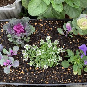 ☆庭のお花達☆ 先日の葉牡丹(デュエット)を プランターに入れてみたら ちょっと寂しそうだったので、 フリルのとタグ🏷️ファミリーの 2株、ピンク系を追加購入、 あとパンジーとアリッサム(白)も 入れ寄せ植えしましたー♪♪♪