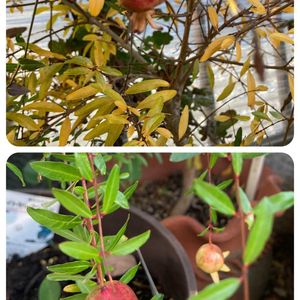 ☆庭のお花達☆ 姫ザクロ2鉢 ↑黄葉した葉に1個の赤い実が 目立っています〜 ↓同じ場所(直ぐ横)なのに こちらは未だ緑🟢の葉と 幾つかの実が可愛い😍