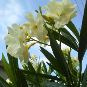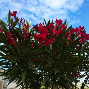 青空に真っ赤に映えてる夏のお花キョウチクトウです😀 やっぱり背景に青空を入れると映えますね🤩 白ももう少しで咲きます😀