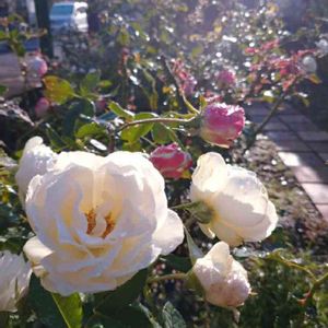 純白のアイスバーグも一つ咲き出しました😊 房咲きで花数が凄く多いので花殻取りが毎年大変です😩今も蕾を150個くらい付けています👨🌾
