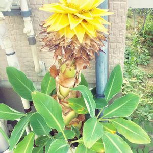 道路の花壇で咲く 地湧金蓮 チャイニーズイエローバナナ バナナの仲間だそうです。 見る期間は長く見られます。