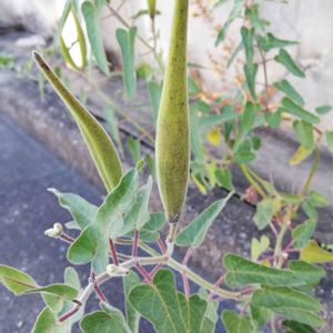 ブルースターの青い実 2022-11-19 自宅の近くの路肩の隙間から遅れて生え出てきた株。途中で花が全部刈り取られる惨劇が起きたが,あとから咲いた花がなんとか実ってこうなった。この後,種子を撒き散らして,来年もここいらに自生してほしい。