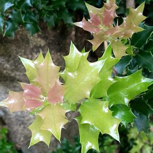 こんにちは まだまだ つづく 冷たい雨… 玄関前の イングリッシュホーリー君⁉️ ギザギザの葉っぱは ホーリー君です…が! 紅の実は 万両さんです❗ ホーリー君 と 万両さん の コラボで す❗ 2022 師走前 の 冷たい雨