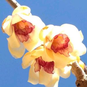 和蝋梅 [ ワロウバイ ] 庭先で 思わず 深呼吸 庭が い~い 香りに 包まれて … 冷たい 風の中にも 春を 感じる ひとときです 🤍 よく見ると … 内側にもうひとつ花があるように見える 透き通った赤紫の花弁が可愛い こういった花弁を『内花被片』というらしい