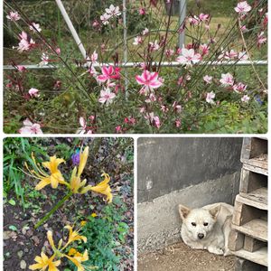 ガウラ沢山咲いてます✨ 黄色いリコリスまた出てきました💛 今朝昨日🐶が居た所を見て来ましたが居ませんでした🥲仕事が終わりまた昨日の場所に行ったら居ました白いのだけ💦 役場の人に直ぐ来てもらい捕まえようとしたのですが逃げられてしまいました。仕掛けを仕掛け様子を見る事に😣