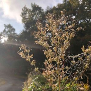 蜘蛛の巣🕸に朝露がいっぱいついて おひさまの光を浴びてキラキラ☆.。.:*・ ちょっと宝石みたいだな… なんて考えながら歩く 寒い朝の散歩道