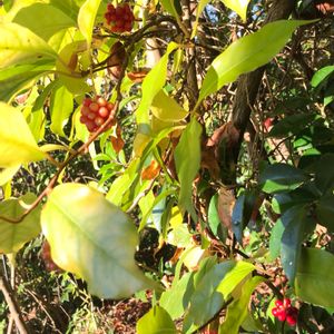 サネカズラ、色付くの遅かった場所のものも赤くなりましたよ。これは勝手に生えてた植物ですが、大きくなってるみたいなので、剪定した方がいいのかな?