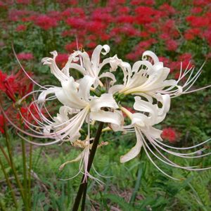 お彼岸に咲くという彼岸花 今日10月1日に満開になりましたが いつも赤い彼岸花がいっぱい咲く 2枚目の写真のところは 白2.赤2本だけ 毎年1つか2つしか咲かない 白い彼岸花は1枚目の写真通り 見事にいっぱい咲きました。