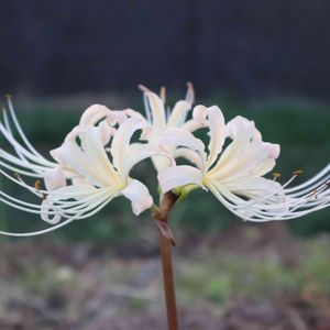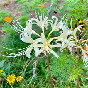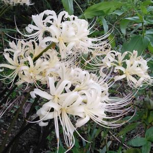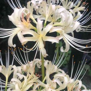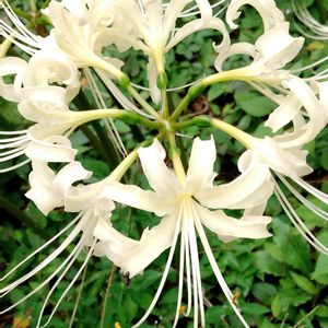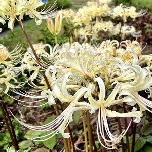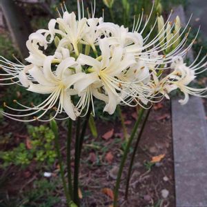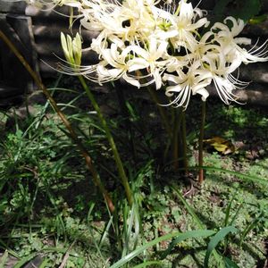 【白いヒガンバナ】【曼珠沙華 白】 あるお宅のお庭にて。 厳密には、ヒガンバナの純系白花種は大変珍しく貴重で、出回っている白花ヒガンバナは、交配種とのことです。