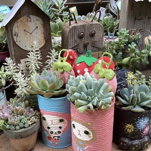 おはようございます😊 🏷️毎月15日はいちごの日に参加します。 ①さくら餅子さんのリメ鉢と多肉。お名前なんだったかな😅 ②えつこさんのいちごマンのリメ鉢と、虹糖?なんて読むのかなあ。 二つとも徒長はしてますが、元気そうです。嬉しいな😃