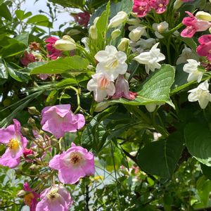 ツルバラ 庭から1.5メートルの段差を利用して ツルバラを誘引をしています🌹 挿し木にと頂いたバラで、名前はわかりませんが、かわいい💕甘い香りがします 少し早く咲いたハコネウツギと。