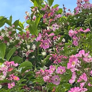 ピンク色に濃いめのピンクの模様 この薔薇も可愛い🩷 小さなお花ですがたくさんの花が伸びて 大きな木になってました 🌸🌹🌸🌹🌸🌹いろんな種類が 目に焼き付いてます どの薔薇も素敵💓😀