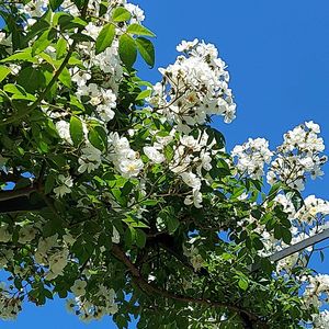 おはようございます😊つるバラでしょうか🌹毎年5月末満開になります、2年前の写真で真っ白になってました。肥料の影響?🌿