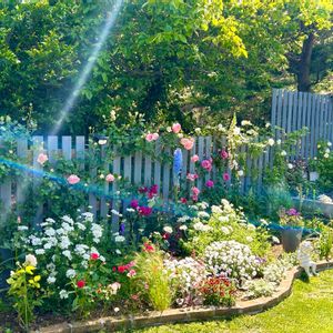 今朝の東側花壇です! 柵の上つるバラ、左からピエール、アイスバーグ、ラ・フォイユリー、アンジェラ 咲き始めました🌹🌹🌹