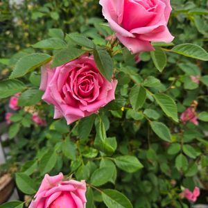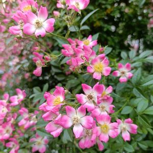 ミニバラ?つるバラ?かな🙄 お名前はわかりませんが、ほんわかと優しい感じのバラです🩷 こんな色合いものバラも素敵✨️ 追記)まいてぃさんに“つるバラ 安曇野”とヒントをいただきました🤗 2025.5.20 近所の病院の花壇📱