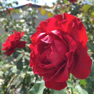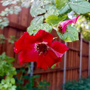 おはようございます🍁 春に咲いて、終わりだと思ってた、つるバラが庭に咲いてました、一つと、蕾が二つ、ふさは春の時の倍の大きさです、赤くて綺麗です💕