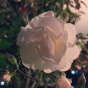 うちのお庭に来てから13年たちました。 とても元気な子です💕 門灯にライトアップされて 綺麗だったのでパシャしました✨ つるバラの種類忘れました😢 何だろう? わかる人がいたら教えてください。