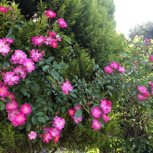 名前を忘れたつるバラ😨 道路沿いのコニファー達に華を添えて💕 同じ方から頂いたスパニッシュビューティーも😊 最後の🌹と同色でコラボしてくれました🎶