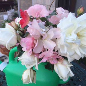 ジョウロで生け花‼️仕立て直しの為に切られたッルバラの花で🌺