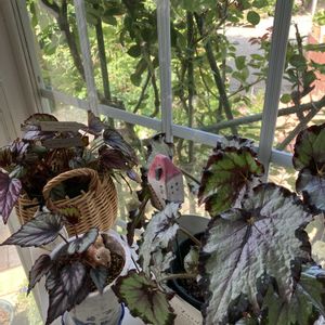 花ともさんのお庭で イキイキ美しい葉のレックスベコニアを見てから その虜に💕 3つに✂️して 葉挿しできるわよ! と知り合いから1枚の葉を頂き 初めての葉挿しに挑戦 ひとつだけスクスク育ってます pic④🍃 その後、偶々ホームセンターで値引きのレックス2つと出会いお迎え pic②③どちらも順調です pic①は 我が家のレックスを並べて🤳 違う葉色のレックスも お迎えしたくなりました どの鉢にも花ともさんからの 可愛いモルタル小物を飾って レックスを見守ってもらってます 🕊️🏠🐇…