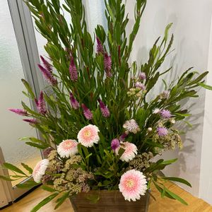 いつもの病院にて 今回は少し状態悪く 3週間めの診察😢 ・アマランサス(ワイン色の花) ・紅葉とペリカム ・ガーベラ ・スターチス ・ヒリュウシダ( 緑の葉)