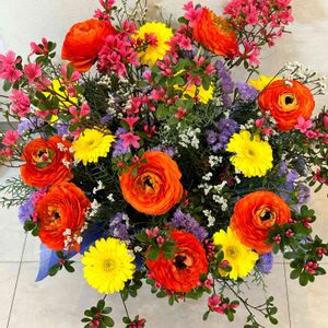風邪を引き持病の喘息発作が出てしまい毎日、点滴を打ちに近所のかかりつけクリニックへ来ています。 いつも綺麗なフラワーアレンジメントで今日はラナンキュラスとガーベラです。