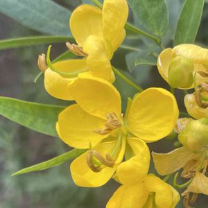 🌱コバノセンナ(小葉の那)🌱 カッシア マメ科 センナ属 花径は3~4cm、2本の湾曲した雄蕊が特徴です。 黄金色してとても明るく正にビタミンカラ~💛💛 花言葉は「輝かしい未来」 ♡輝かしい未来のある若い方々が不意の事故で大勢犠牲になられご家族の悲しみが計りしれません!! 心からお悔やみ申し上げます!!🙏 ウクライナやロシアの若者の輝かし未来も戦争で破壊され本当に可哀想です!! 一日も早く戦争が終わり平和な日々がお暮れますように!!🙏 ある病院の院長先生が自ら花木を育てていられます。 2022年10月29日撮影です。