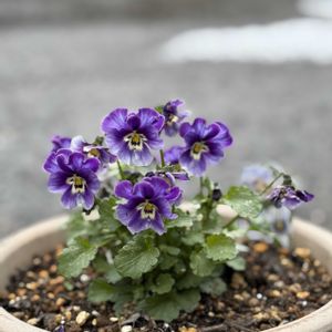ついにウチにもやってきた高級ビオラ✨✨ 園芸やり始めた頃は普通の一株100円のパンビオでも十分満足していたはずなのに、毎年GSで素敵なパンビオコレクションを見ているうちに、目が肥えてきた気がします🤭 サトウ園芸さんのビオラ・ヌーヴェルヴァーグ「ラピスラズリ」 『趣味の園芸10月号』で見て惚れ惚れし、普段行かない園芸店まで苗を探しに出かけました🚗雑誌で見たようなシャボン色にはならなかったけど、とっても美しくて、人気がある理由がよくわかりました✨ 咲き始めは濃い紫ですが、咲き進むと色が抜けて少し雰囲気が変わります。気温が上がってきたらまた色が変わるでしょうか?今後の変化も楽しみです😊 寄せ植えの他の花も徐々に賑わってきました🌱