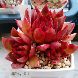 こんばんは🌔 今朝の最低気温予報は0℃だったので防寒はしませんでした ベランダ多肉はまだ凍みません 今日の多肉は“ムース” 赤くてカッコいいです