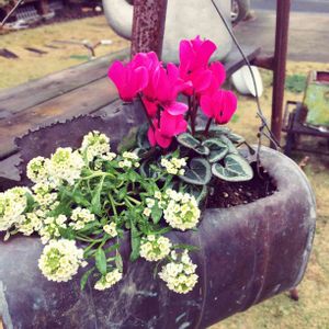 霧の月曜日です ガーデンシクラメンを花壇に植えると寒さに負けてしまう庭なので、古い湯たんぽに寄せ植え もう少し寒くなったら、軒下へ