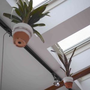 冬支度やり直し(^.^ この写真は2鉢しか吊ってませんが、冬支度の初期には3つの天窓付近にアイアンのラダーを吊ってそこに40鉢ほどブロメリアを吊りました(^.^ それで日照不足を最低限にしエアコンの風も当たらず温度も最低でも13℃ぐらいは確保(暖房時は20℃ぐらい)し、水やりも最低限の手間を実現していたのですが、ここで見直し(^.^ 理由は、かなり部屋に明かりが届かない事と、普段生活していてふと上を見るとご覧の通りに鉢の底しかみえず、なんか気持ち良くないこと(^.^ 鉢底を白く塗ってはみたもののイマイチ! 他の吹き抜けの場所も同じく見栄えが良くない(^.^ さて、次はどうしよーかな。