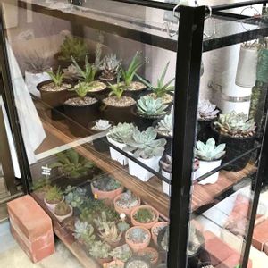 初めての投稿♡‼︎ 庭の多肉棚に多肉ちゃん集合〜〜‼︎ 玄関にいた子達も集めて、夜はプチプチのカーテン掛け始めました(๑・̑◡・̑๑)