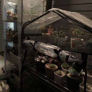 ドライガーデン 初めての冬 ある程度耐寒性のあるものを植えていますが、子株達には苗ドームを被せました。
