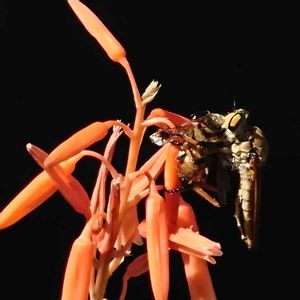 おはようございます♪ 今朝の沖縄の天気は曇り。 昨夜は久々にしっかり雨が降ってくれたので、植物たちが生き生きしている気がします♪ アロエ の花に止まっていたのはお食事中の アオメアブ さん? ミツバチさんが捕まっていました。