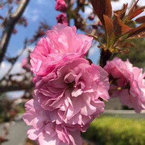 こんばんは。 パート先への通勤で通る道の、歩道と車道の境目に植えられている八重桜です。 暖かくなってきて、蕾が綻んできたなぁと思っていたのですが、ポツポツと咲き始めました。 蕾が綻び始めてから、通勤中に変化を見ながら歩くのが楽しいです。 歩道の脇には乙女椿が植えられているので、乙女椿から八重桜への花のリレーも楽しいです。